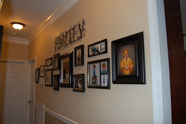 The color we chose for the wall is Benjamin Moore, AF-670; Nightingale, in an egg shell finish. This color allowed harmony between the slate gray tile floor with a lighter grout color, the accent glass tile surrounding the beautiful garden tub, and light brown/tan granite counter top. It also allowed us to bring the room more to scale and not focus so much on all the colors, but giving your eye peace. We added an area rug for warmth under the double sink, but this also neutralized much of the dark slate gray tile and brought in our accent color from the granite counter top. We also added another area rug in front of the standing shower, however, this is was in the same color as the tile. It contained a tone on tone patter matching the larger area rug. By adding a medicine cabinet above the toilet and moving the towel bar to above the garden tub we really accented the 9' ceilings. Adding the personal touches in grays and browns draws your eye around the room easily without confusion. We personalized the space for the client by adding cute baby photos of their son under the newly purchased art work. The new shower curtain contained the dark and light colors of the bathroom without competing for attention within the room.